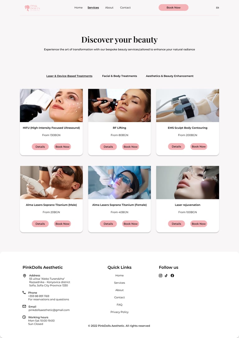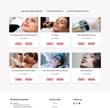 Tabbed categories and card-based layouts simplify browsing and comparison, helping users quickly identify the treatments that suit their needs.